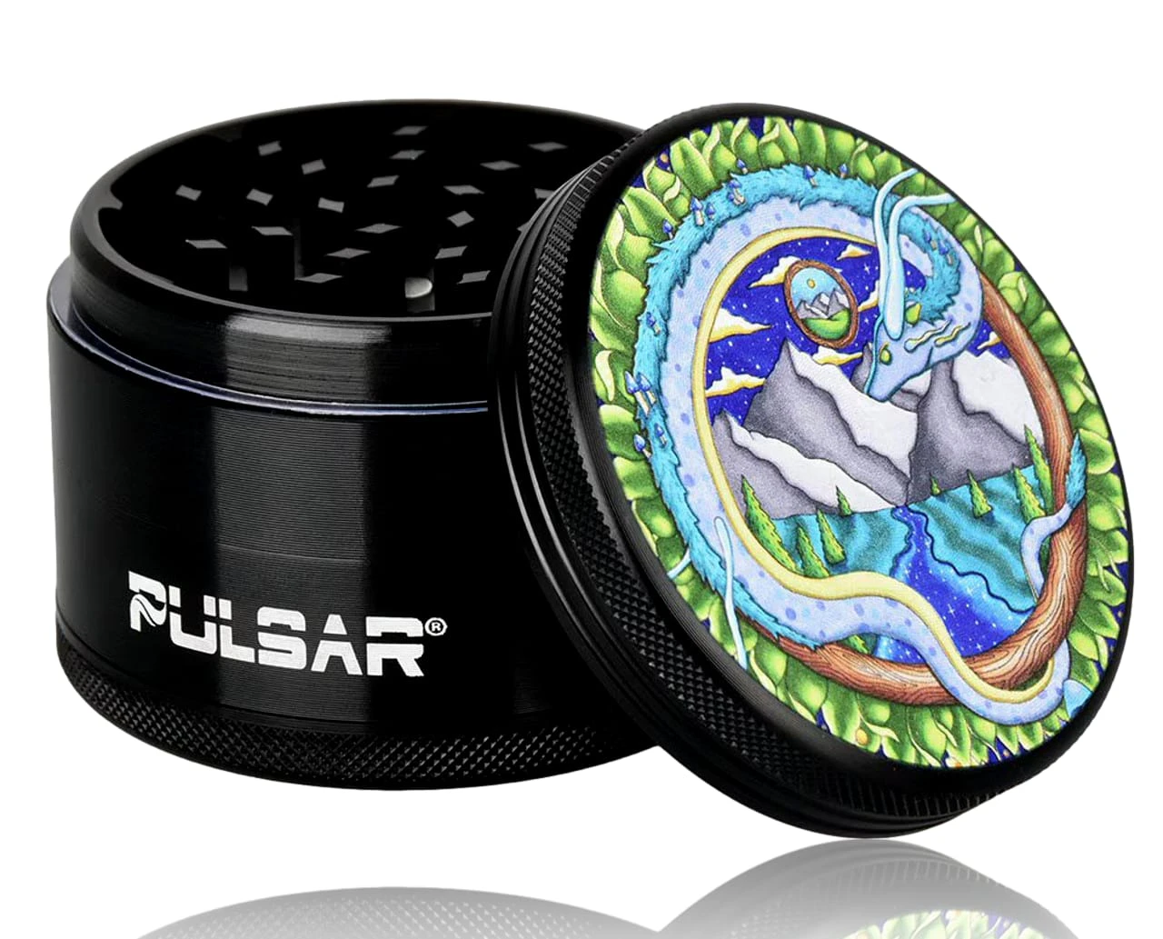 The Pulsar Artist Series Metal Grinder featuring the Remembering Dragon design is a visually striking addition to any herb enthusiast's collection. This 4-piece grinder measures 2.5 inches in diameter and offers efficient herb preparation with its durable metal construction.