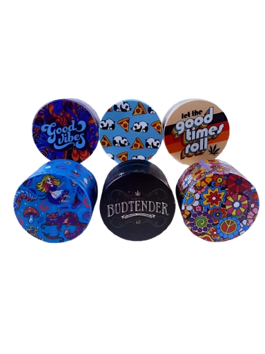 The Wacky Grinderz - Good Vibes 6ct Display brings positive energy and functional grinding power to your herb processing needs. This set includes six 2.5" herb grinders featuring colorful "Good Vibes" designs, perfect for spreading positivity and fun throughout your smoking accessories collection.