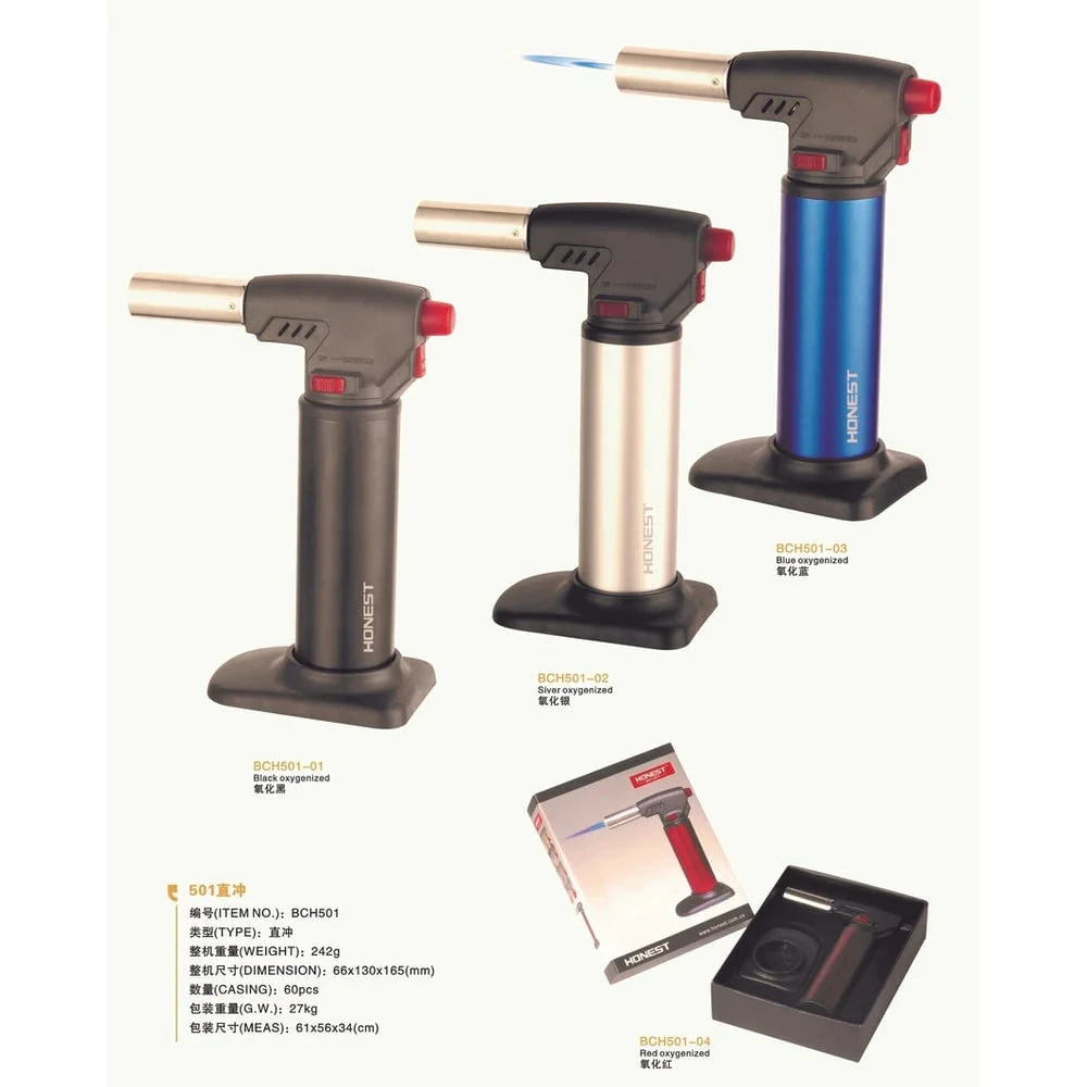 The Crème Brule Style Torch Lighter comes with adjustable flames, child-resistant trigger, and a refillable tank. Sold as 1 unit.